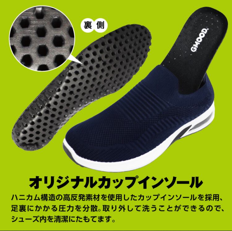 ハニカム構造の高反発素材を使用したオリジナルカップインソールを採用、足裏にかかる圧力を分散。